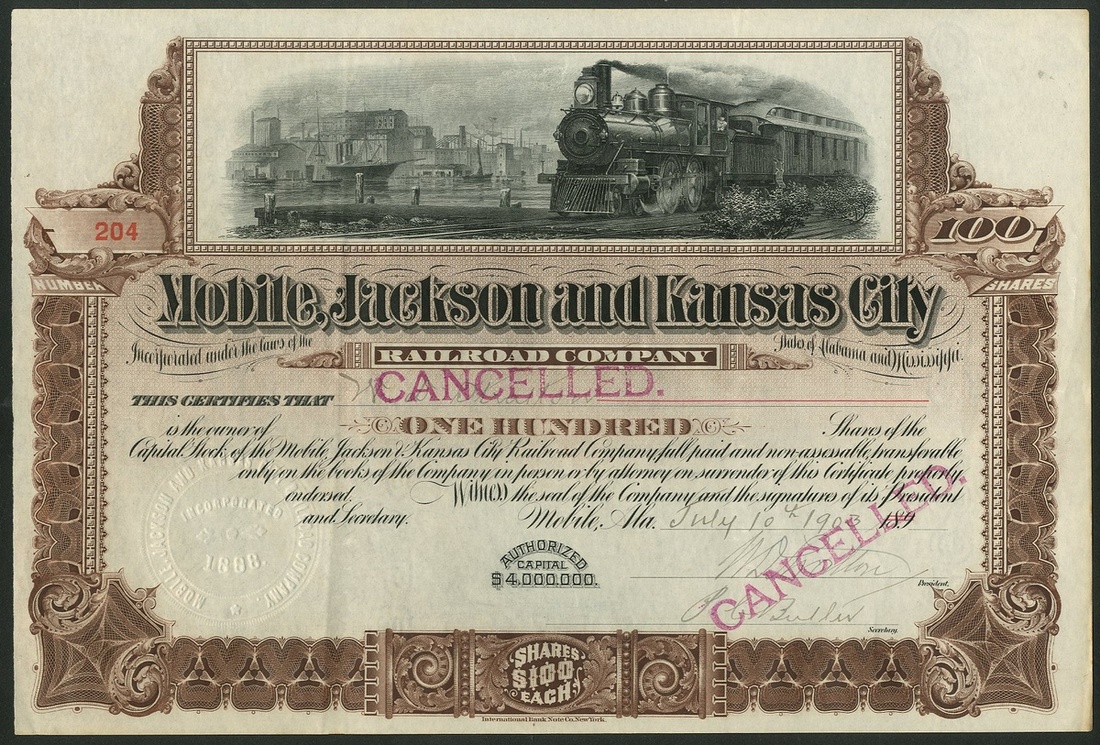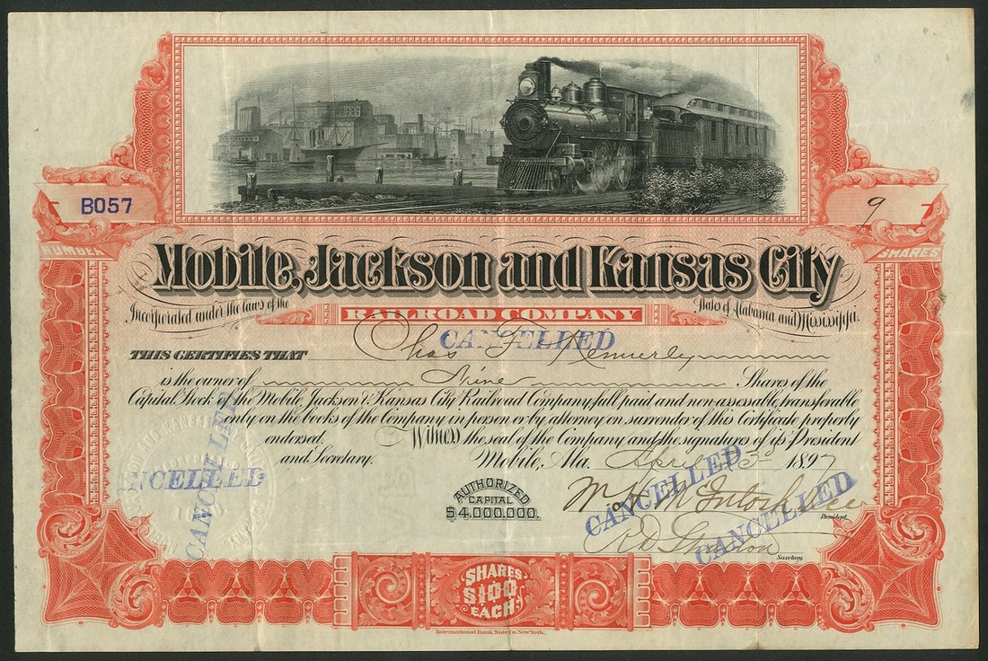 Mobile, Jackson and Kansas City Railroad Co., Alabama and Mississippi, $100 shares, 189[7], #B057 and 100 x $100 shares, 189[1903], #204, attractive vignettes of speeding train with dockside in background, red and brown respectively, both stamped cancelled. VF (2).