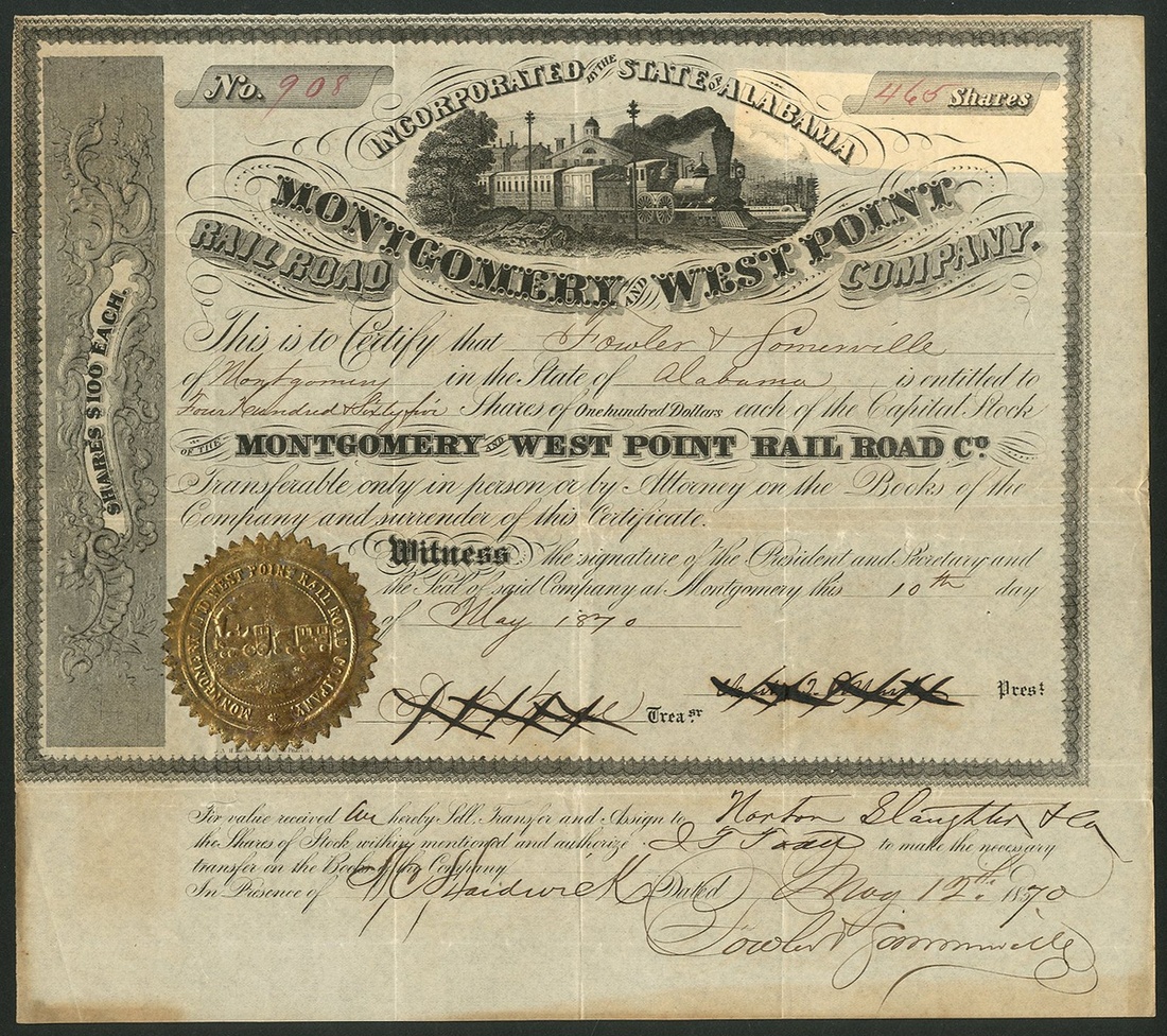 Montgomery & West Point Rail Road Co., Alabama, $100 shares, [1870], #908, steam train at top, black, gold seal, ink cancelled. VF.