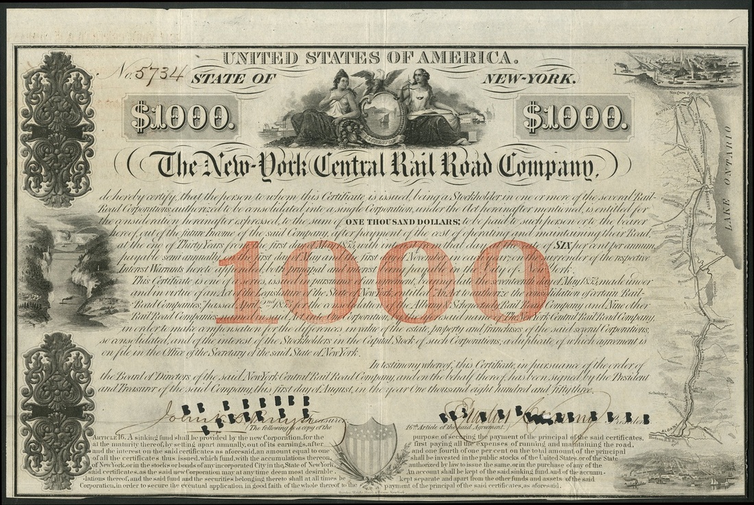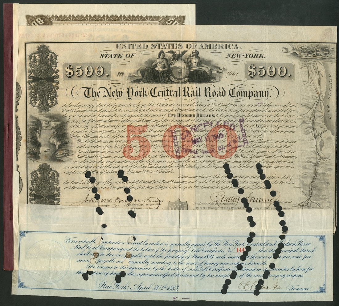 New York Central Rail Road Co., bond for $1000, 1853, #5734, map of the railroads route down right side, view of the river left, black with red underprint, together with a bond for $500, design as before, #1441, with attached Debt Certificate dated 1892, all cancelled. VF (2).