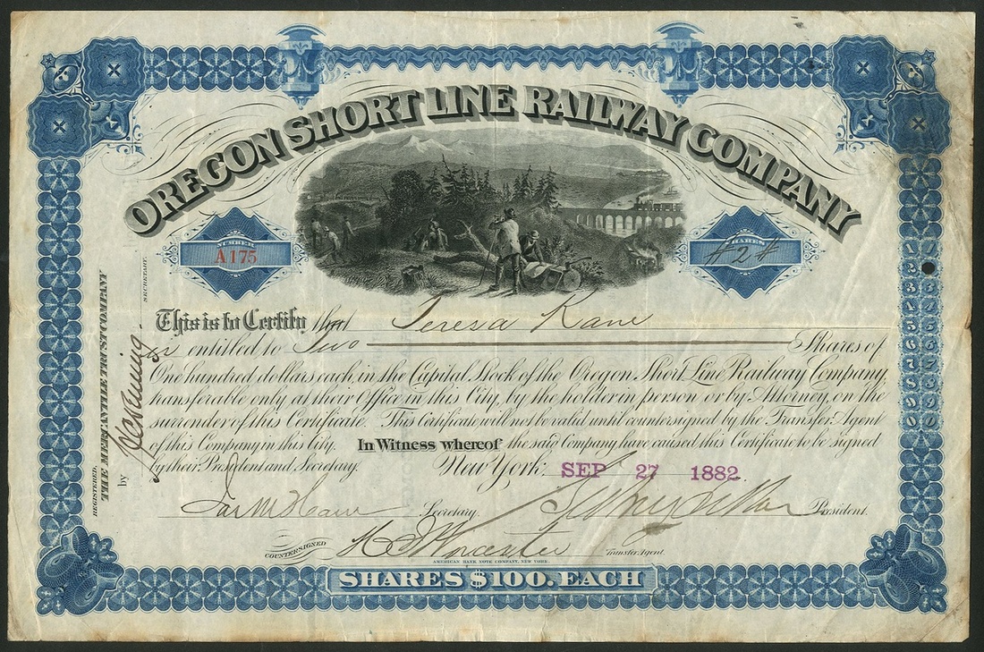 Oregon Short Line Railway Company, $100 shares, New York [1882], #A175, signed by Sidney Dillon as President, surveyors at work with steamtrain crossing viaduct in background, blue and black, NOT cancelled. Sidney Dillon (1812-1892) constructed numerous US railroads and was one of the principal contractors for the Union Pacific. He took part in the laying of the last rail of the First Transcontinental Railroad in 1869, receiving one of the ceremonial silver spikes used to complete the project. He was involved in the Crédit Mobilier of America scandal. For many years, he was President of the Union Pacific Railroad and an important business partner of Jay Gould. Creased, F-VF.