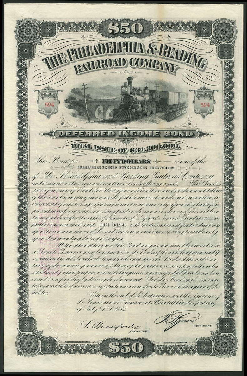 Philadelphia & Reading Railroad Company, deferred income bond, 1882, $50, #594, steam train at top, black, with coupons. The more difficult to find denomination. VF.