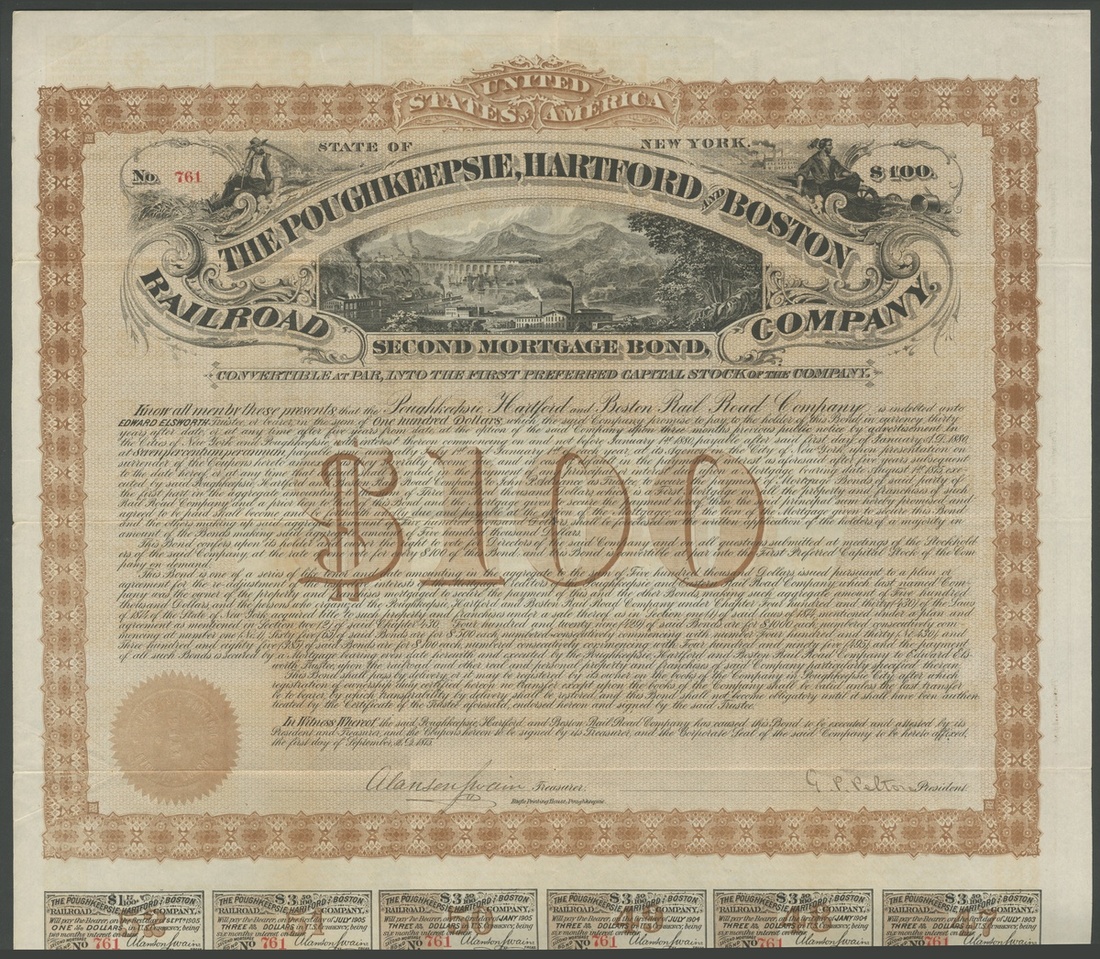 Poughkeepsie, Hartford and Boston Railroad Co. (NY), second mortgage bond, $100, 1875, #761, large format piece with vignette of river scene with factories and steam train crossing bridge, orange-brown and black, with coupons. GVF.