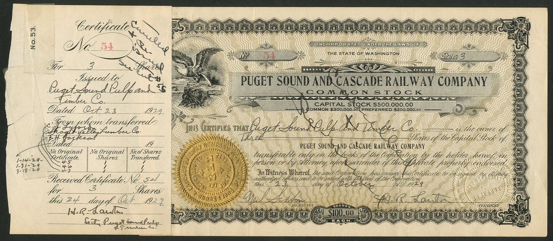 Puget Sound and Cascade Railway Company, Washington, $100 shares, 19[29], #54, eagle top left, black, gold underprint and seal, printed by Goes, ink cancelled and counterfoil reglued at left. GVF.