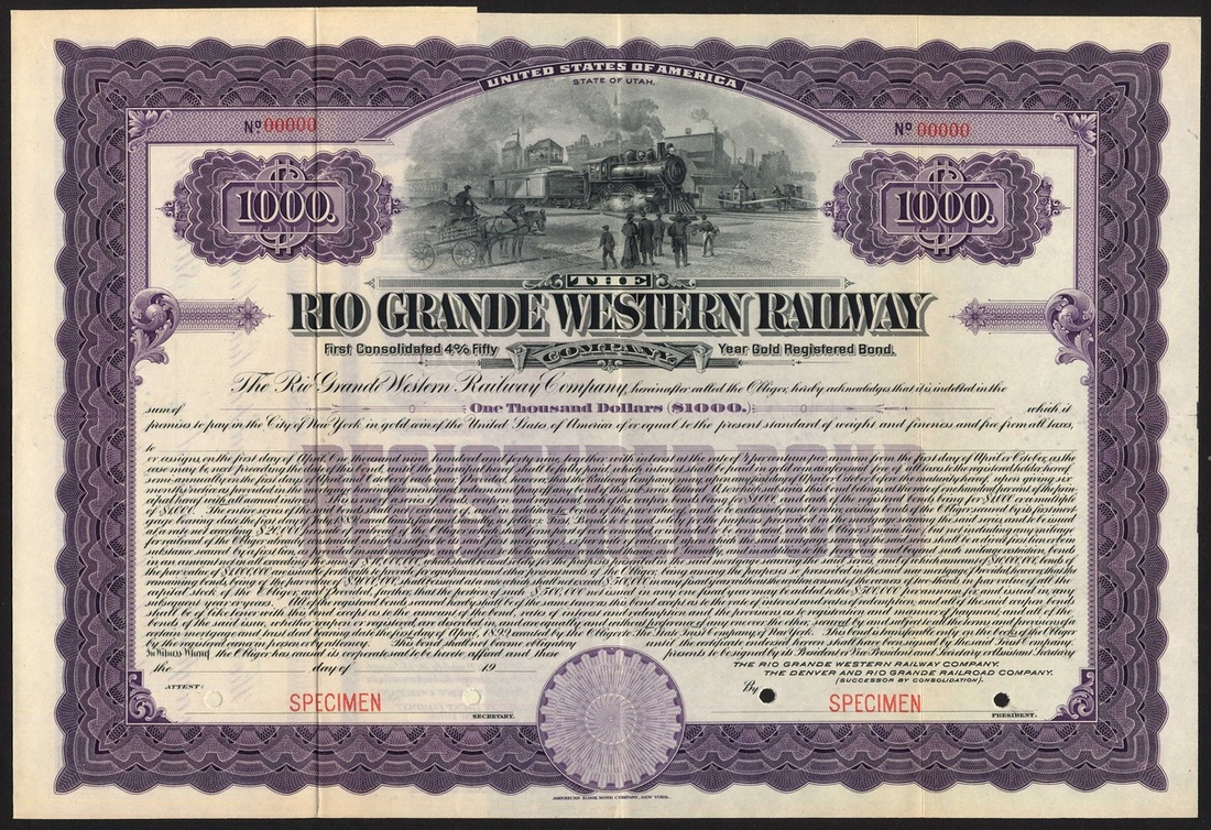 Rio Grande Western Railway Co. (UT), SPECIMEN first consolidated 4% 50yr gold registered bond for $1000, 19--, circa 1905, printed by the American Bank Note Co., steam train passing through crossing at top, ornate border, purple and black. VF.