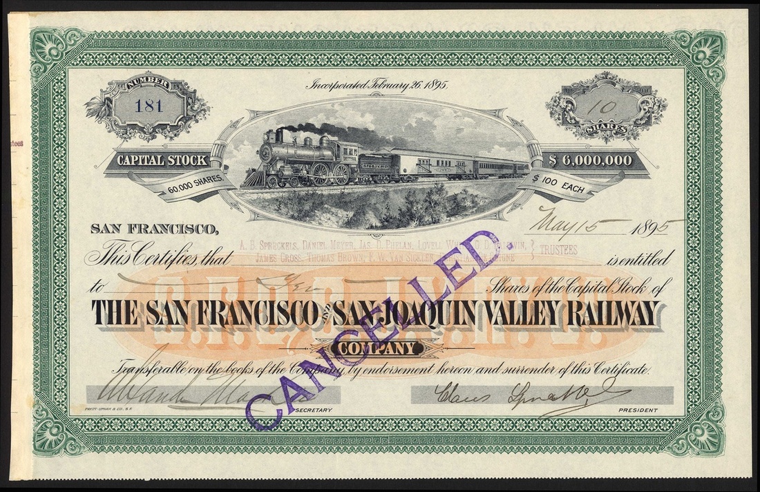 San Francisco and San Joaquin Valley Railway Co., $100 shares, 189[5], #181, signed by Claus Spreckles as President, vignette of steam train, green and black with orange underprint. Claus Spreckles (1828-1908), nicknamed the 'Sugar King', sugar refiner and land owner in California and Hawaii. Stamped cancelled across face, EF.