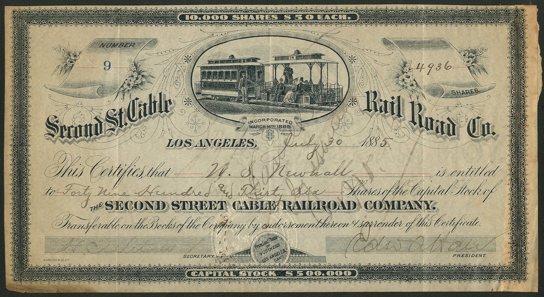 Second Street Cable Rail Road Co., Los Angeles, $50 shares, 188[5], #9, for a total of 4936 shares, almost half of the capital, issued to Walter S. Newhall and signed by him on the reverse, attractive vignette of tramcars, black. Walter Scott Newhall, 1860-1906, son of California pioneer, Henry Newhall (The town of Newhall north of Los Angeles was named after him), president of the California Club, built 21 Chester Place which was used in the TV series the Adams Family as the spooky mansion. Also signed by Edward A. Hall as President and H.C.Witmer as secretary, who, with Newhall, formed the Los Angeles Improvement Company mainly to develop the outskirts of the city. To aid the developement this cable line was built to the 900 acres of Crown Hill which had just been purchased by the Land company. The line was extremely successful and all the land lots were sold within 18 months. Cancelled with residue of counterfoil on reverse, toned but VF and rare.