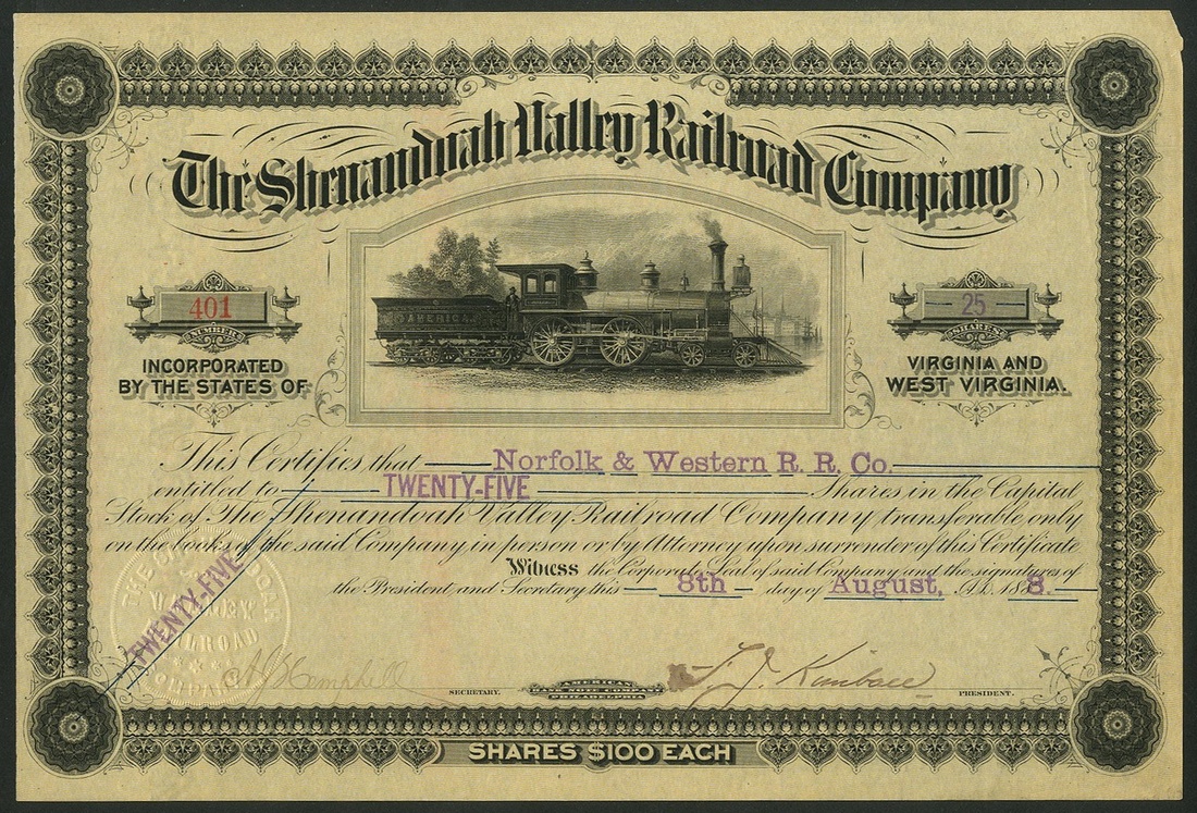 Shenandoah Valley Railroad Company, Virginia & West Virginia, $100 shares, 188[8], #401, steam train in centre, black on cream paper, NOT cancelled. EF.