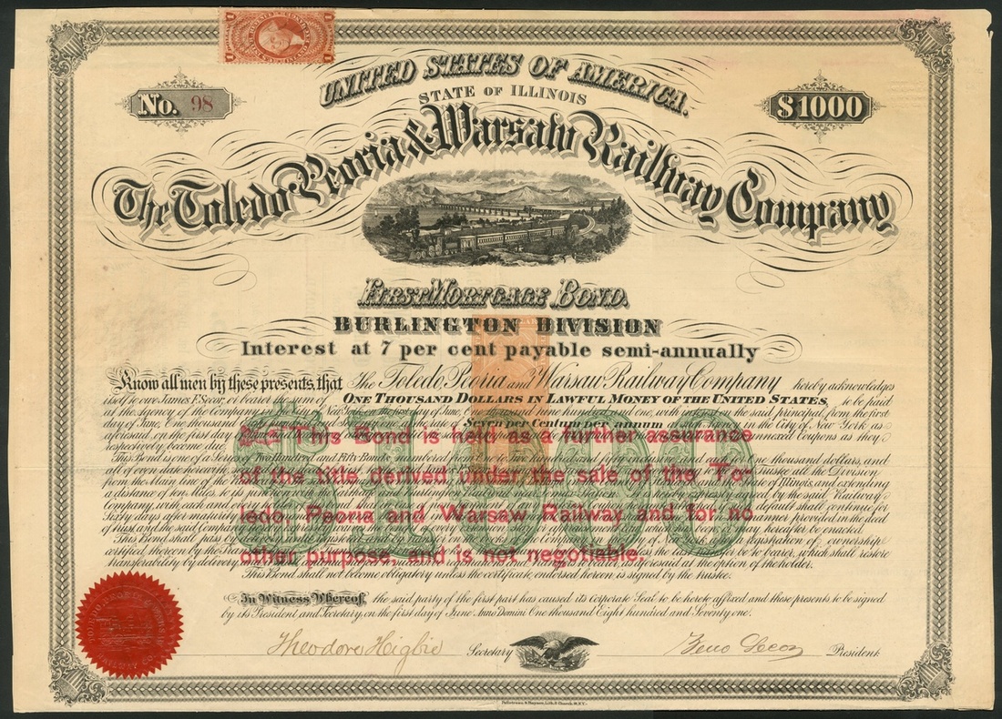 Toledo, Peoria & Warsaw Railway Co., 7% First Mortgage bond, Burlington Division, $1000, 1871, #98, large format piece with steam train crossing bridge, black, green $1000 in underprint, $1 imprinted revenue stamp in orange-brown, red overprint, with coupons. Split at fold otherwise VF and scarce.