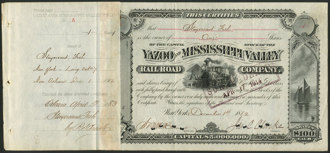 Yazoo and Mississippi Valley Railroad Co., $100 shares, 18[82], #5, issued to Stuyvesant Fish and signed by him on the reverse, steam train in centre, sailing boat at right, black, hand cancelled across face, counterfoil reglued at left. Stuyvesant Fish (1851-1923), railroad and banking executive. President of the Illinois Central for many years until ousted by E.H.Harriman for misuse of funds.VF.