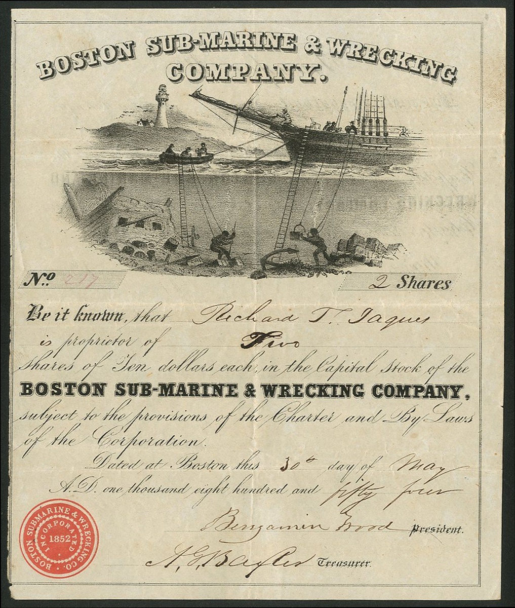 Boston Sub-Marine & Wrecking Company, $10 shares, 18[54], #217, a large unique vignette of divers under the sea recovering goods with sailing ship above, unusual format, black, red seal. Formed in 1852 as a general wreck recovery company. Hunted for the treasure of the 'San Pedro de Alcantera' near Venezuela and later searched for wrecks off the coast of the Dominican Republic. VF and very rare.