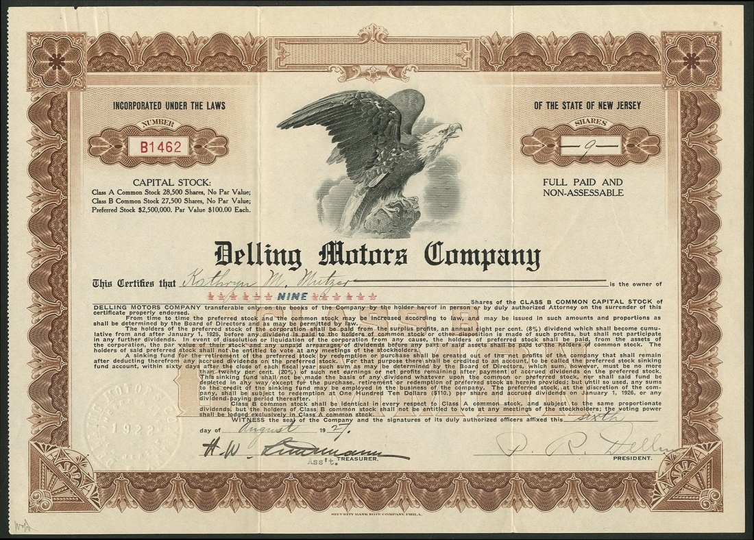 Delling Motors Company, New Jersey, Class B common stock, 19[27], #B1462, eagle at top, brown and black. Formed by Eric Delling, an ex employee of Stanley Steamers with a factory in West Collingwood. Only a few cars were made until 1927 when the company just produced a few commercial vehicles. Delling was later chief engineers at Brooks Steam Motors. GVF.