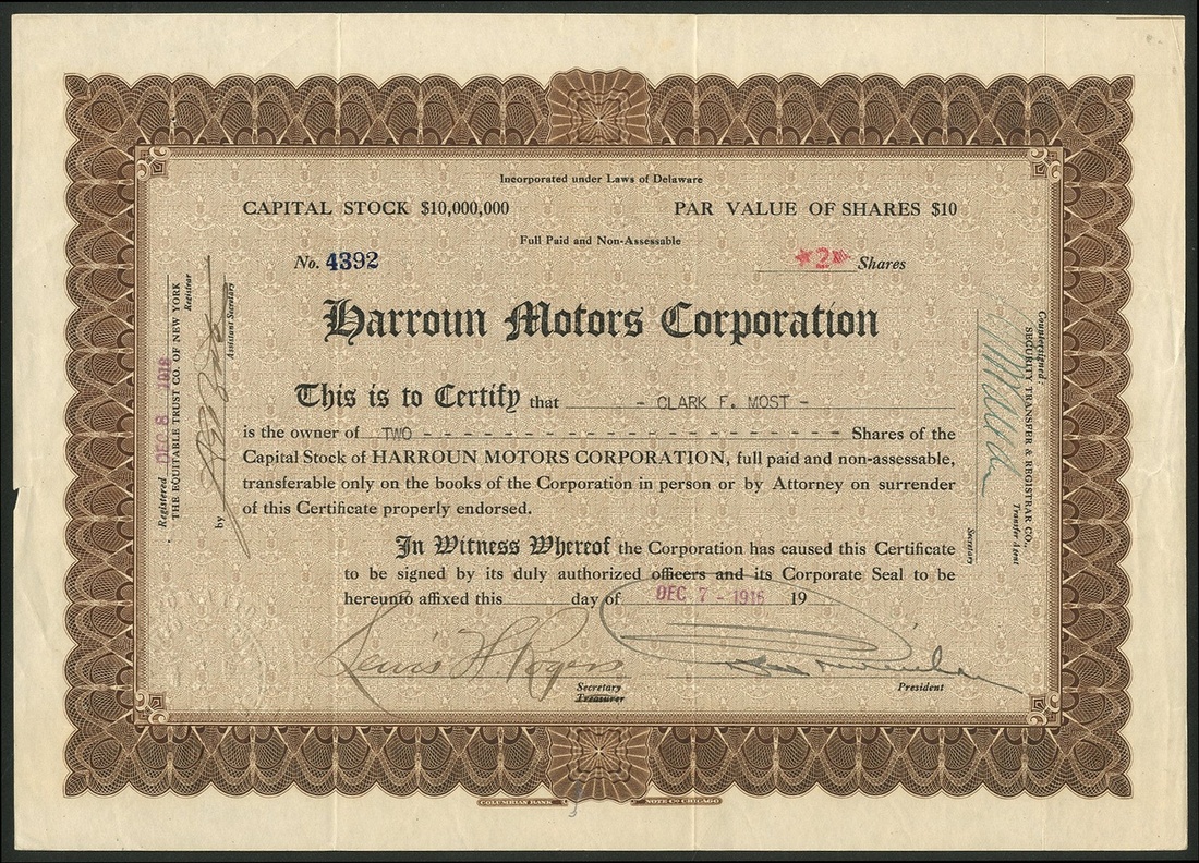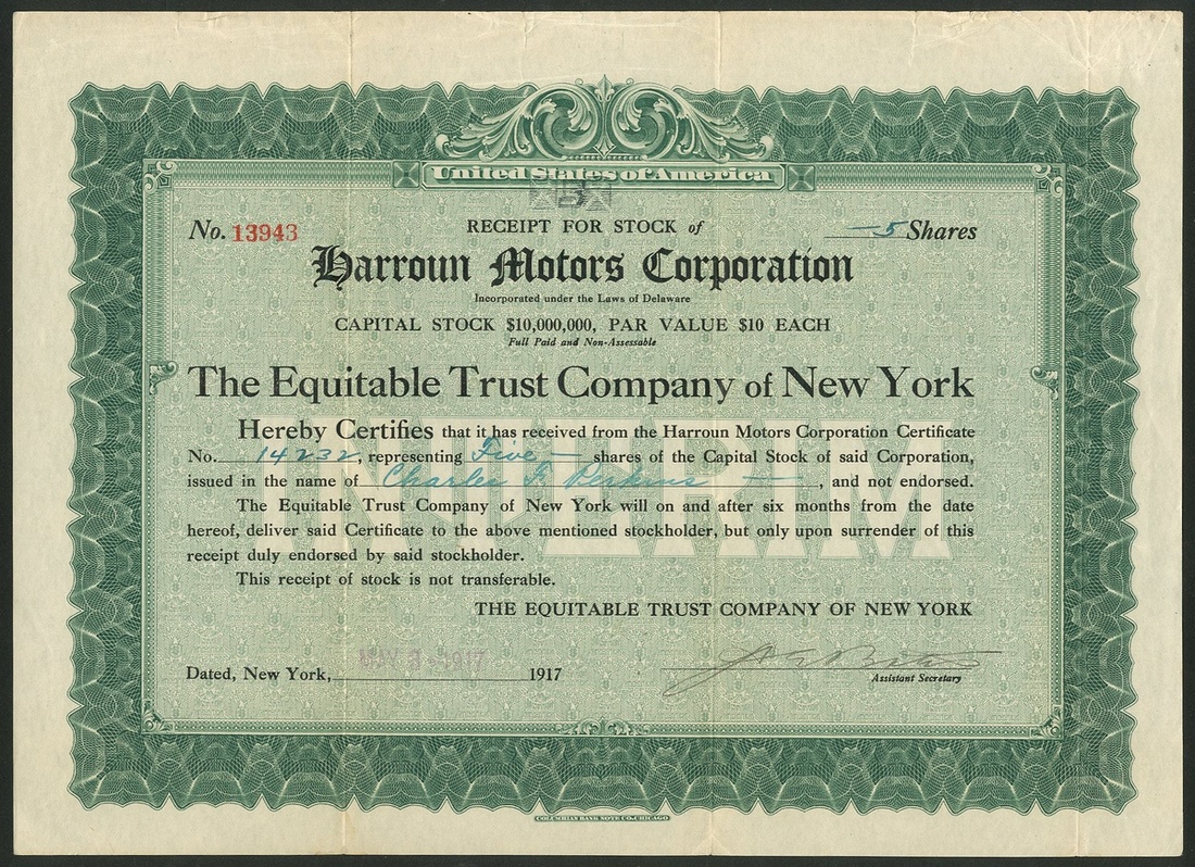 Harroun Motors Corporation, Delaware, $10 shares, 19[16], #4392, brown together with a receipt for stock issued by the Equitable Trust Company of New York, 1917, #13943, green. Ray Harroun, the winner of the first Indianapolis 500, developed his own car in Wayne, Michigan in 1917 producing more than 500 cars before the factory was turned over to munitions manufacture. Although motor production carried on from 1919 numbers were very small and company failed in 1922. VF (2).