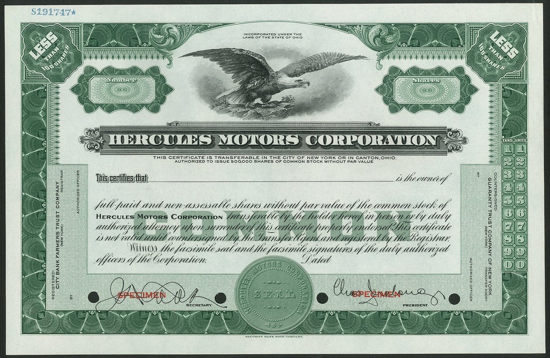 Hercules Motors Corporation, Ohio, a specimen certificate for less than 100 shares, common stock, undated but 1923 or later, eagle at top, green and black, printed by the Security Bank Note Company, overprinted SPECIMEN in red. Founded in 1915 as Hercules Motor Manufacturing Company to build engines for trucks and goods vehicles. Reorganised as this in 1923. Made a significant contribution to the war effort supplying 750,000 engines for military vehicles, ships and equipment. Bought out by the Hupp Corporation in 1961 which in turn was purchased by White Truck. Defunct in 1999. EF and rare.