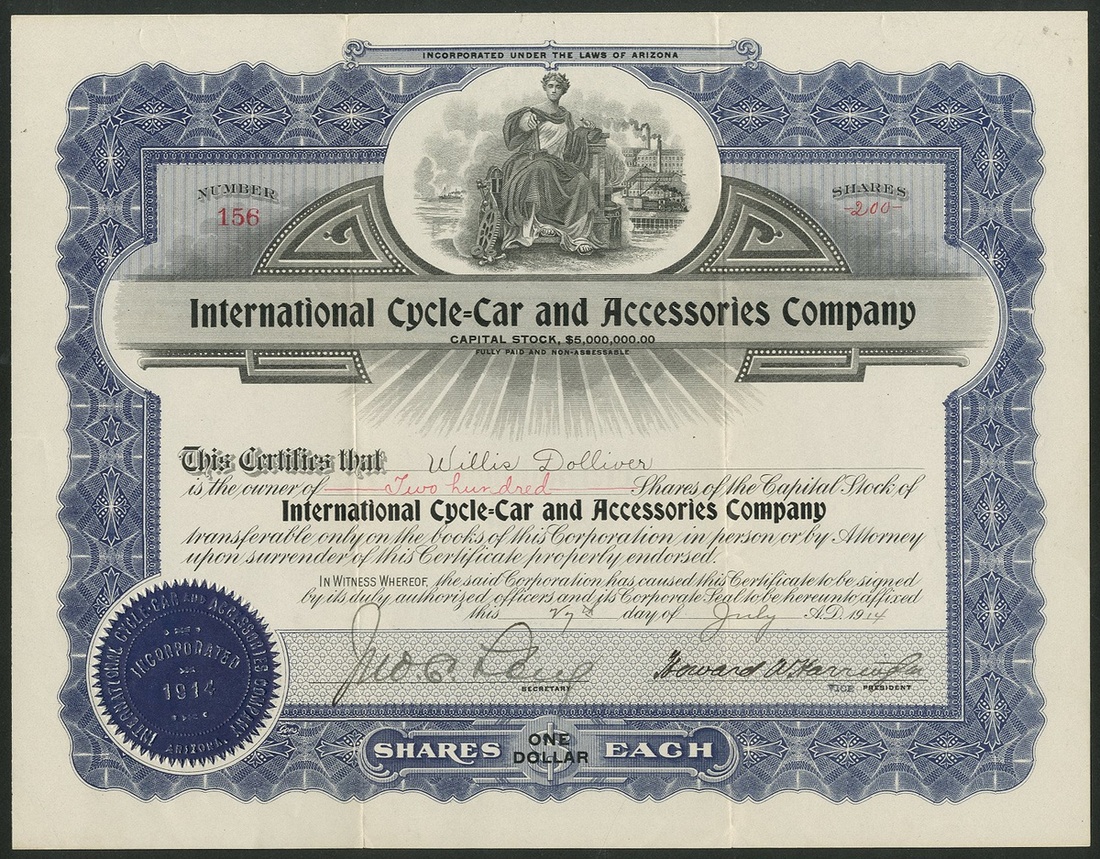 International Cycle-Car and Accessories Company, Arizona, $1 shares, 19[14], #156, allegorical figure at top, blue and black. Formed in 1914 to manufacure the 'Economycar' in a 100,000 square foot factory at Providence, Rhode Island. The company also distributed the Woods Mobilette and the company was actually bought out by Woods in 1915 so their plans to build the Economycar came to a halt with only a few hundred produced. GVF and scarce.