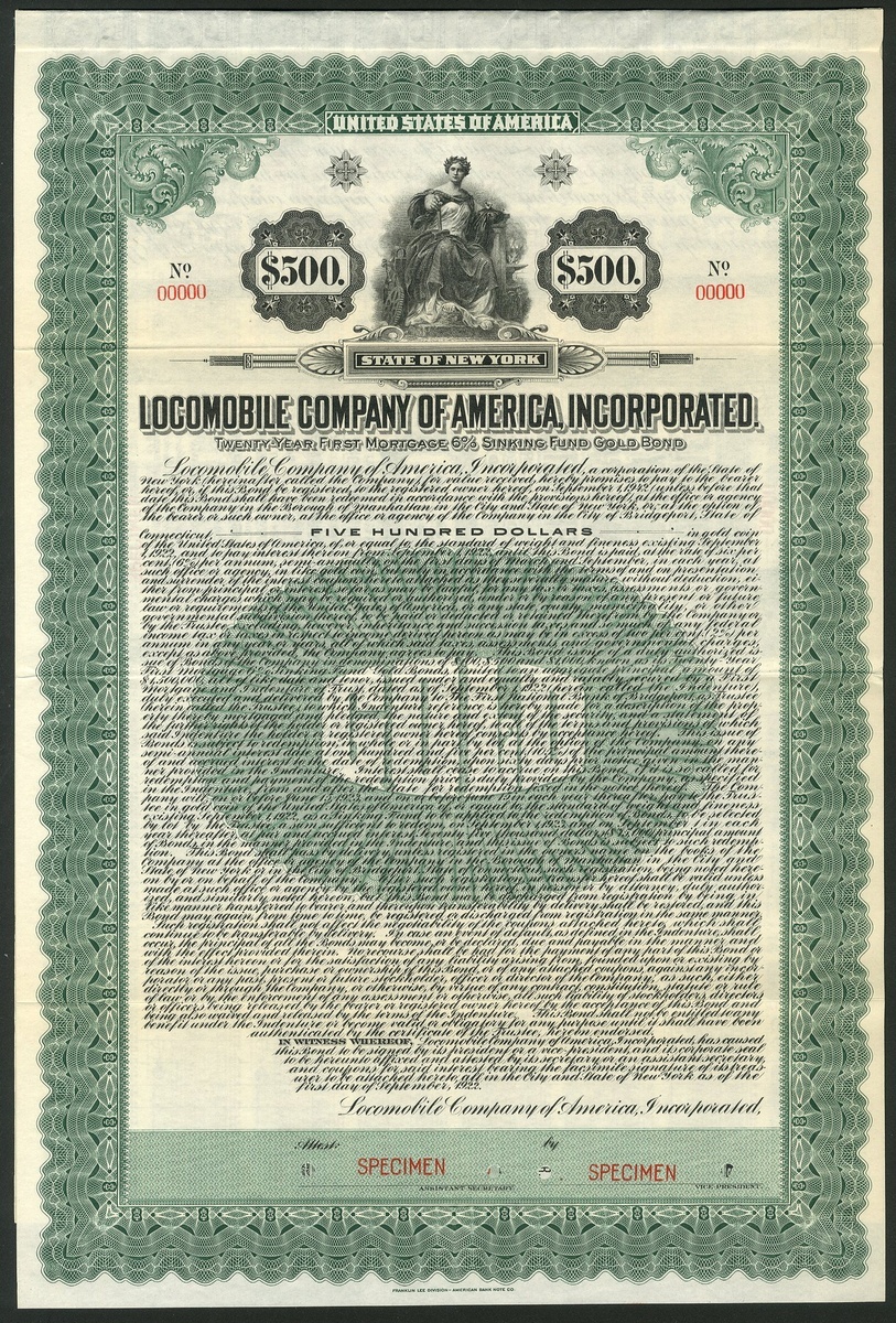 Locomobile Company of America inc., 20 year First Mortgage 6% Sinking Fund Gold Bond, $500, 1922, a specimen certificate from the American Banknote Co. archives, vignette of allegorical female, green and black, with coupons, numbered 00000 and overprinted