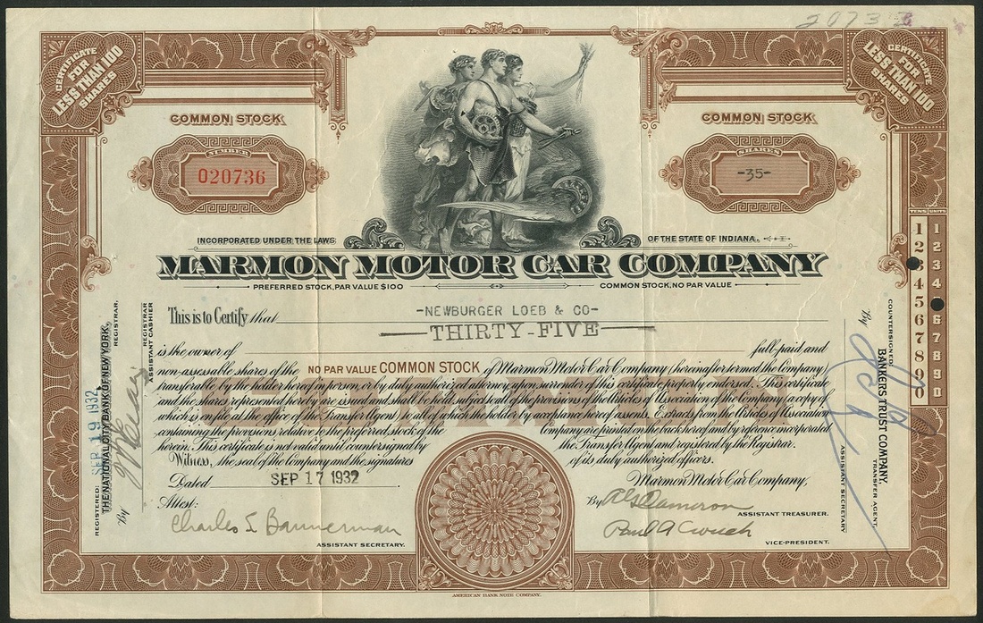 Marmon Motor Car Company, Indiana, less than 100 shares common stock, [1932], #O020736, allegorical figures, brown and black, ABNCo. VF.