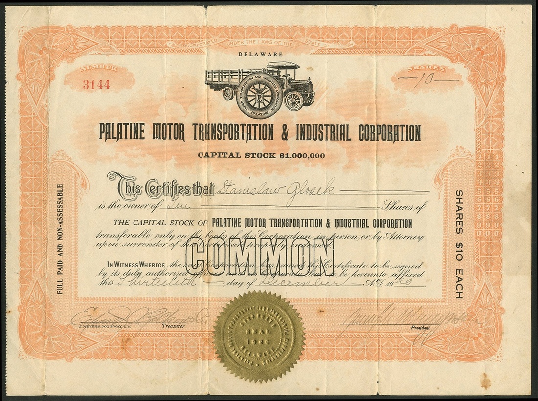 Palatine Motor Transportation & Industrial Corporation, Delaware, $10 shares, common stock, 19[20], #3144, vignette of motor truck, orange and black. F-VF.