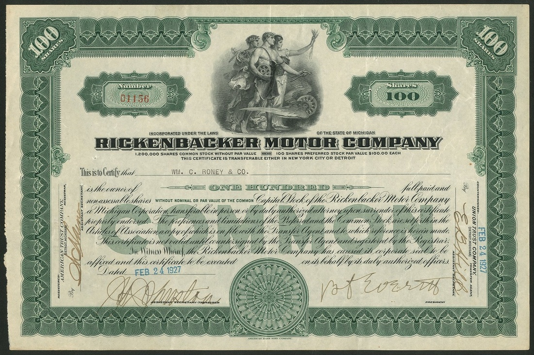 Rickenbacker Motor Company, 100 shares, common stock, [1927], #D156, Detroit register, allegorical figures with winged wheel, green. Promoted by World War I air ace and racing driver, Captain Eddie Rickenbacker, the company manufactured many different models between 1922 until 1927. VF and scarce issue.