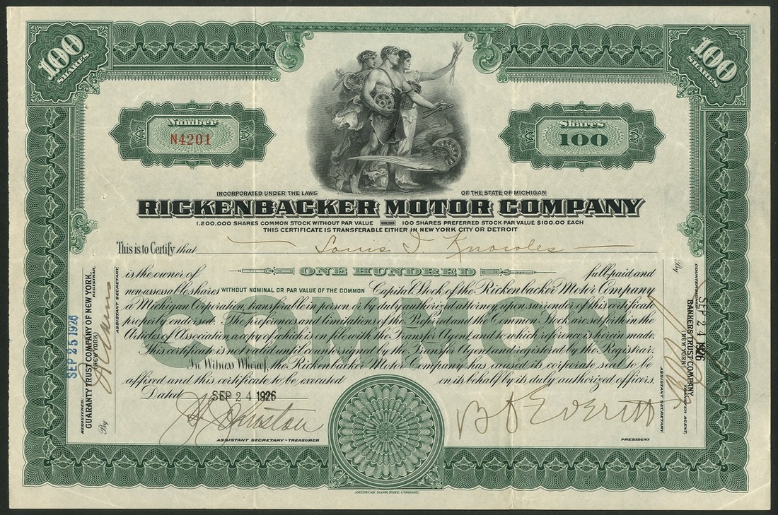 Rickenbacker Motor Company, pair of certs, 100 shares, common stock, #N4201, and less than 100 shares, #NL3258, both [1926], both New York register, allegorical figures with winged wheel, green and orange respectively. Promoted by World War I air ace and racing driver, Captain Eddie Rickenbacker, the company manufactured many different models between 1922 until 1927. VF (2).