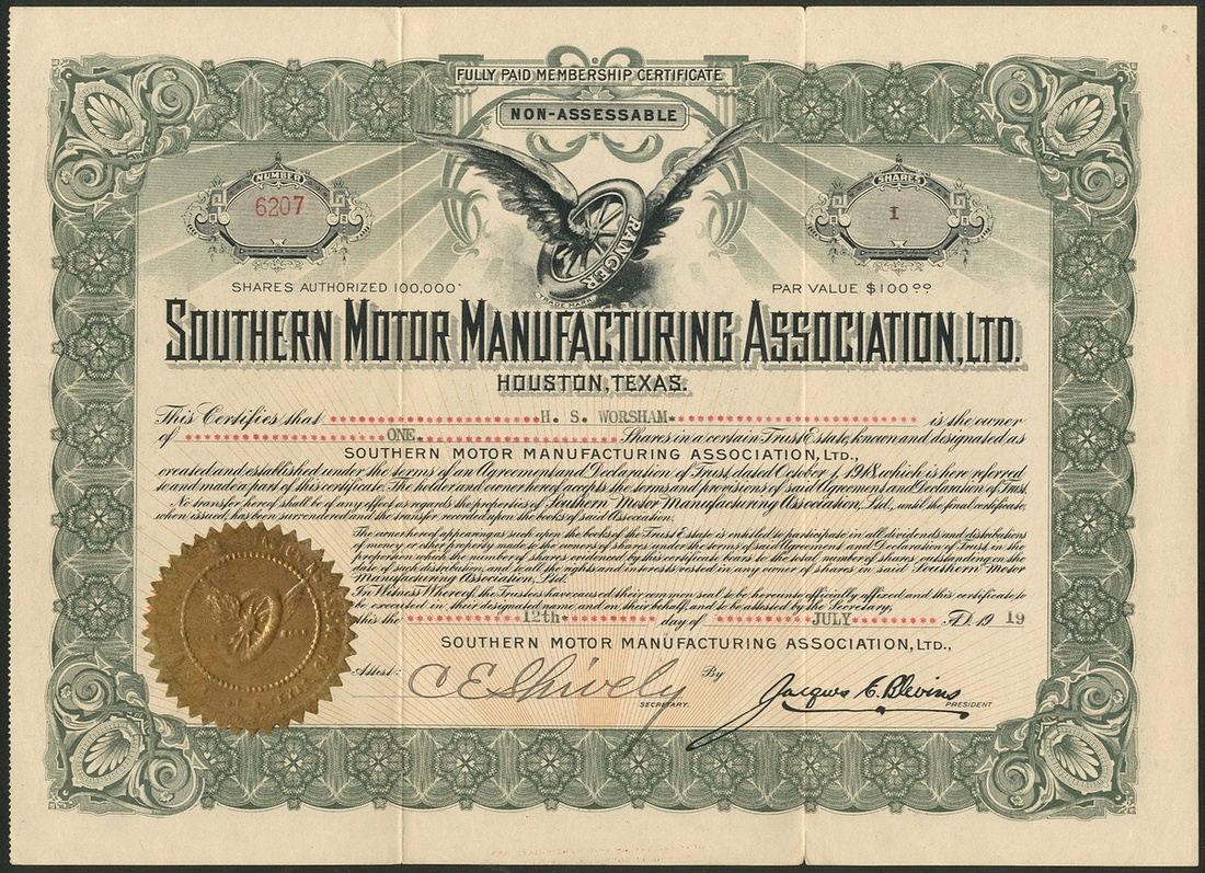 Southern Motor Manufacturing Association Ltd., Texas, $100 shares, 19[19], #6207, winged wheel at top, green, gold seal. Established in Houston in 1919 to manufacture the Ranger automobile together with trucks and tractors. Production appeared smooth until 1922 when the company entered receivership and a merger with National Motors followed. In 1924 several former officers of both companies were indicted for fraud stating that hardly any cars were made and that the whole enterprise was a stock selling operation. VF.