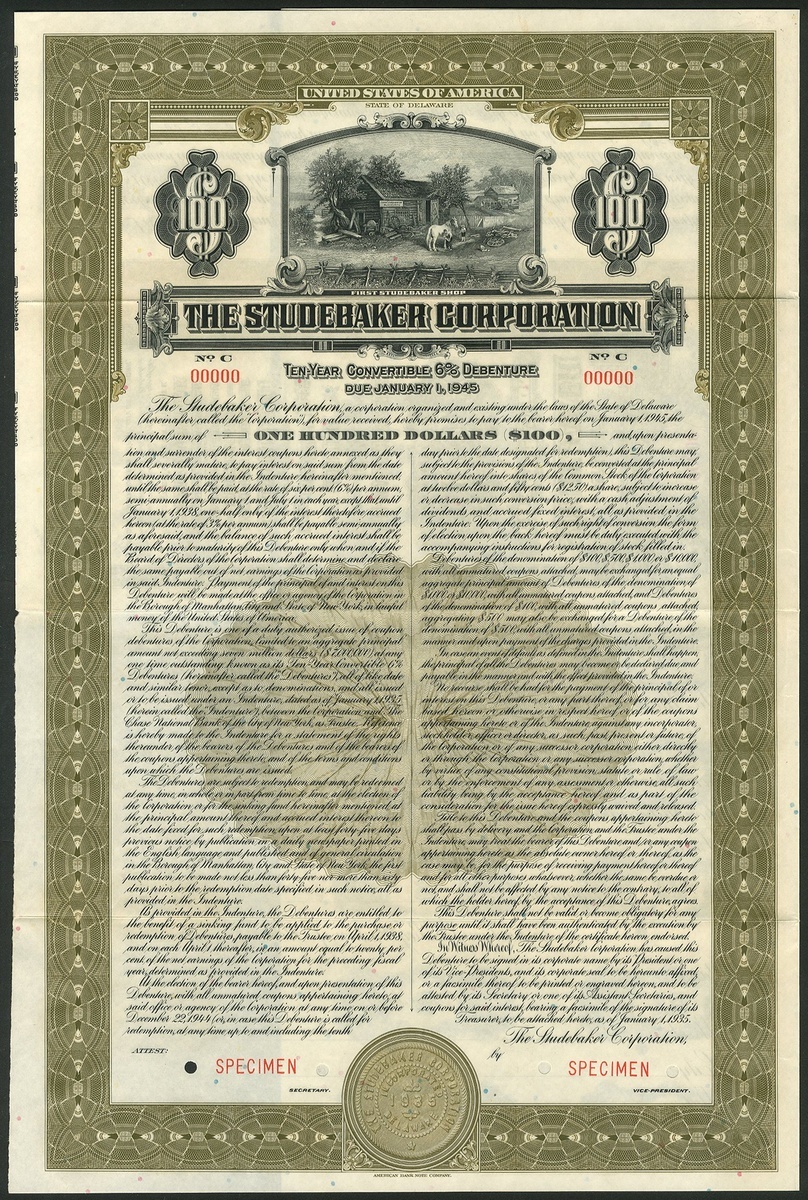 Studebaker Corporation, Delaware, 10-Year Convertible 6% Debenture, 1935, a specimen bond for $100 from the ABNCo. archives, vignette of the now famous Studebaker workshop, olive green and black, overprinted SPECIMEN in red, numbered 00000, with coupons. VF-EF and rare.