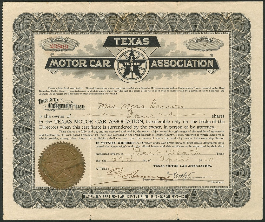 Texas Motor Car Association, $50 shares, 19[20], #23869, wheel behind Texas star, black, gold seal. A Dallas co-operative that built the Texan from 1917 until 1922, failing from a combination of post war slump conditions, infuena epidemic and competition from Ford's Model T. Small splits at folds and a small tear at top edge. VF.