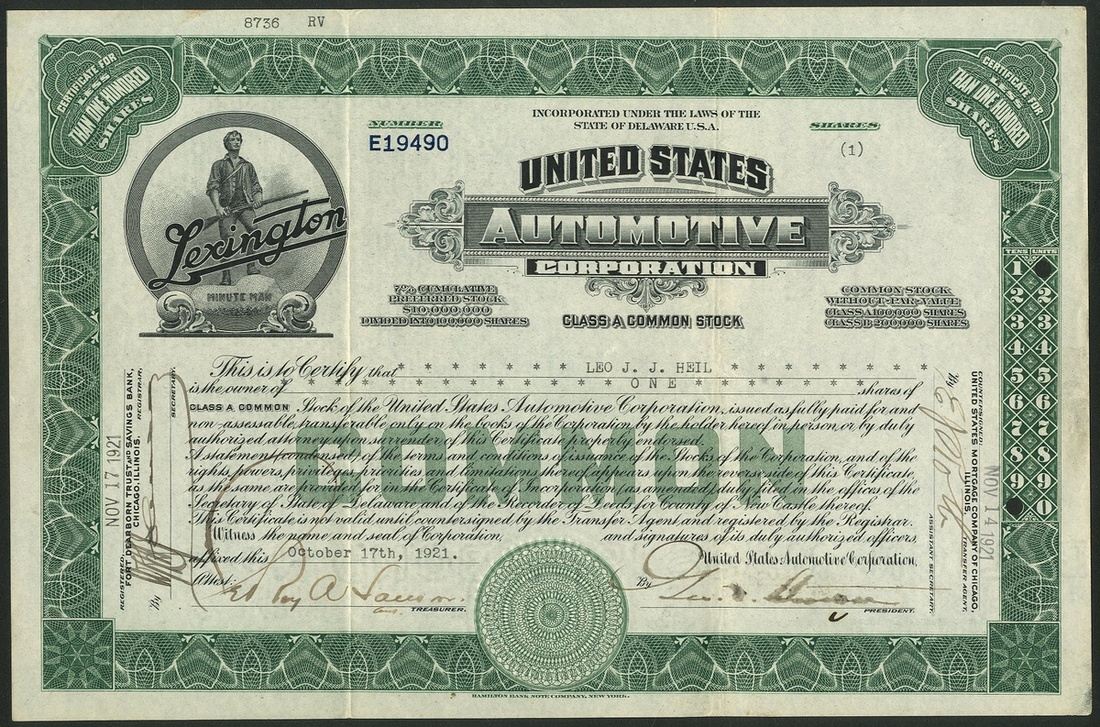 United States Automotive Corporation, Delaware, pair of certificates for less than 100 shares common stock, #E19490, green, and less than 100 shares preferred stock, #G18419, orange, both with the 'minute man' Lexington logo at top left. A combination of all the companies controlled by E.W. Ansted who was originaly a spring and axle manufacturer from Connersville, Indiana. The Lexington marque was produced from 1909 until 1927 when it was taken over by Auburn and the name was phased out. VF (2).