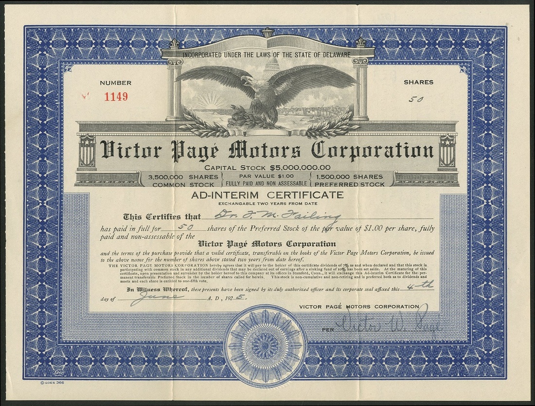 Victor Pagé Motors Corporation, Delaware, $1 shares of preferred stock, 192[5], #1149, handsigned by Victor W. Pagé, eagle at top, blue and black. Formed by Pagé, a well known inventor and engineer with a factory in Farmingdale, New York, later adding a plant in Stamford, Connecticut. Only 128 cars were produced however and the company was embroiled in litigation brought about by stock selling irregularities. VF..
