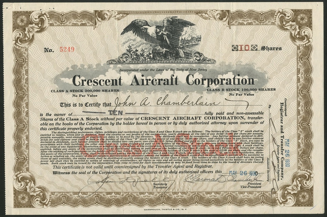 Crescent Aircraft Corporation, New Jersey, Class A stock, [1930], #5249, signed by Clarence D. Chamberlain as President, eagle at top, brown and red. Incorporated in 1928 to manufacture aircraft in a converted cotton mill in Jersey City together with Chamberlain Aeronautics Inc. They made a handful of 8-passenger monoplanes and set several short flight records in the US in 1930. In receivership in September 1930. Chamberlain bought the company from the receiver. Chamberlain, 1893-1976, was a noted trans-Atlantic flier and considered one of the best in the world. VF.