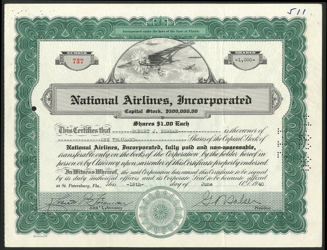 National Airlines Inc., Florida, $1 shares, 19[40], #737, airplanes at top, green and black. Originally formed in 1934 but incorporated in 1937, was soon operating one flight per day between St.Petersburg and Jacksonville carrying mail and passengers. By 1938 was flying between Daytona Beach and Miami and also Jacksonville to New Orleans. Awarded lucrative New York - Florida route in 1944 to become a major airline. Purchased by PanAm in 1980. VF.