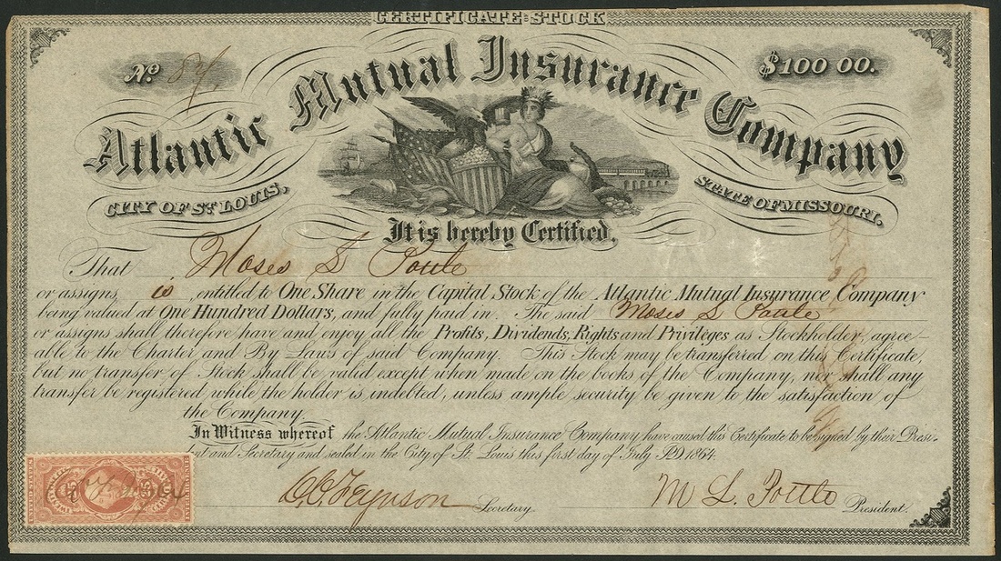Atlantic Mutual Insurance Company, Missouri, $100 share, St.Louis 1864, #87, allegorical figure in centre, black, adhesive revenue stamp. VF and rare.