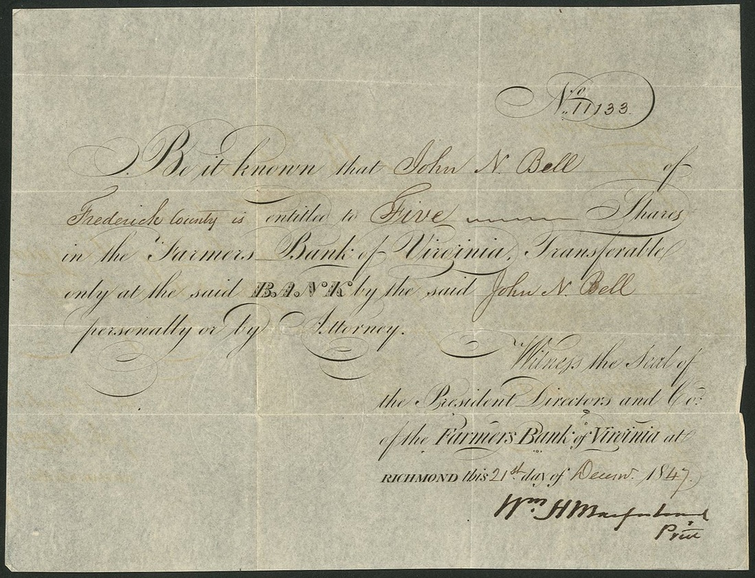 Farmers Bank of Virginia, [5] shares, Richmond 18[47], #11133, signed by William Macfarland as President, simple black printing, embossed seal. William Hamilton Macfarland, 1799-1872, lawyer and banker. Member of Virginia State legislature, 1822-24 and again 1830-31, delegate to Virginia secession convention in 1861. Delegate from Virginia to the Confederate Provisional Congress in 1861-62. Counsel to Jefferson Davis during his trial for treason. The bank was founded in 1812 and liquidated in 1867under the rules of the Reconstruction Government. VF and scarce.
