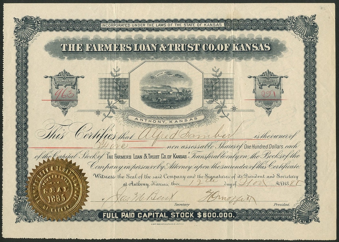 Farmers Loan & Trust Co. of Kansas, $100 shares, Anthony, Kansas 18[88], #963, vignette in centre, black, gold seal. GVF.