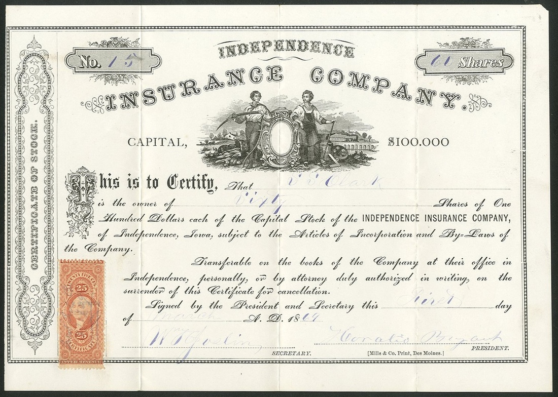 Independence Insurance Company, Iowa, $100 shares, 18[69], #15, signed by Horatio Bryant as President, allegorical figures and shield in centre, black, printed by Mills & Co. of Des Moines. Dr. Horatio Bryant, 1809 - 1899, physician and surgeon, president of the Board of Education and County Supervisor at Independence. His estate was divided between Taor College Iowa and Talladega College Alabama. Tip of top right corner missing, VF.