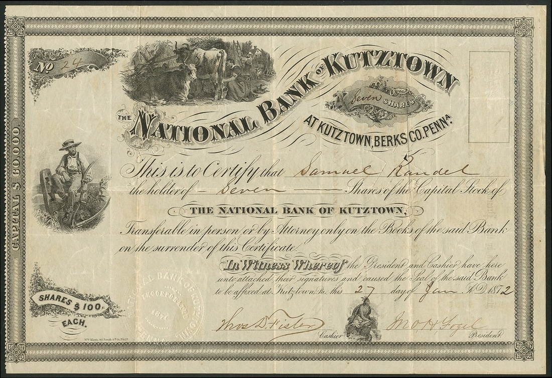 National Bank of Kutztown, Pennsylvania, $100 shares, 187[2], #24, cattle and farmer, black, neat cut cancels. VF.