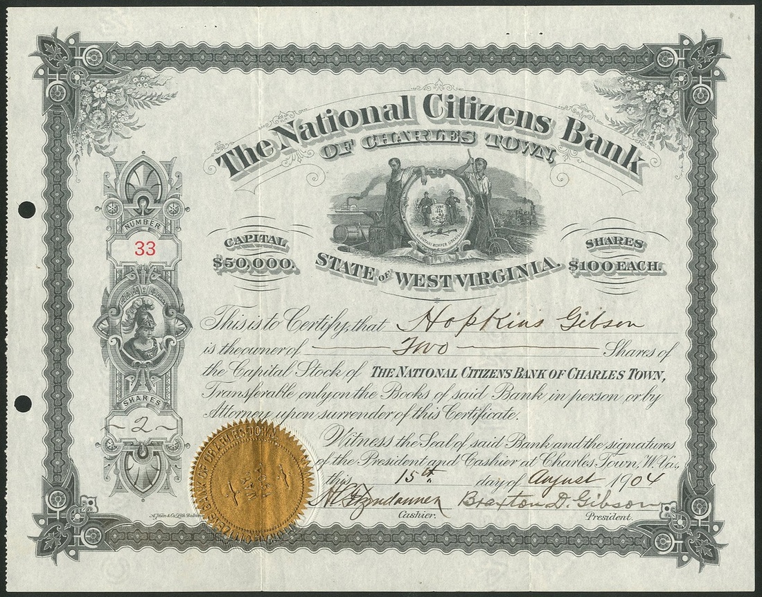 National Citizens Bank of Charles Town, $100 shares, 19[04], #33, Virtus at left, State motto in centre, black, gold seal. NOT cancelled. VF.