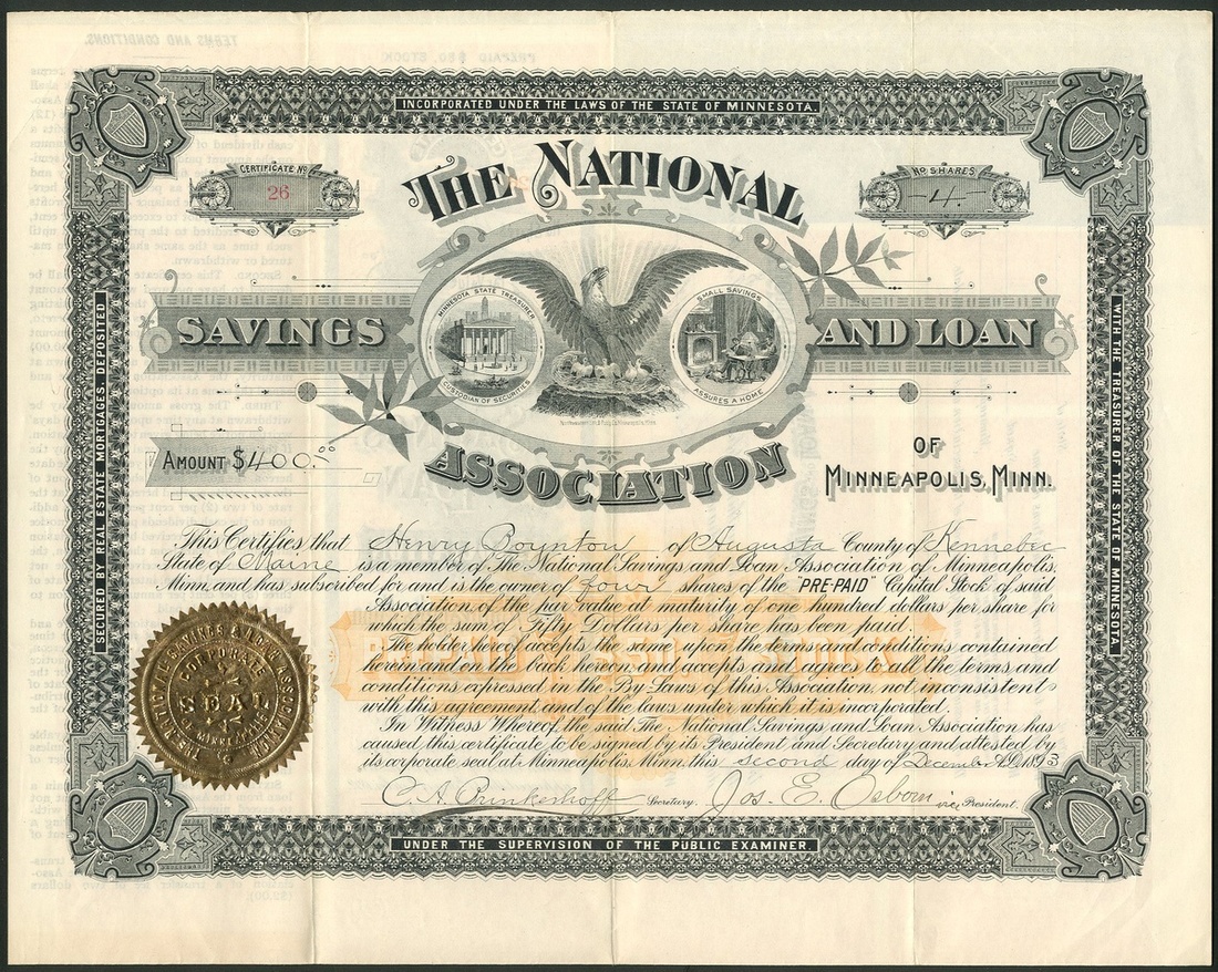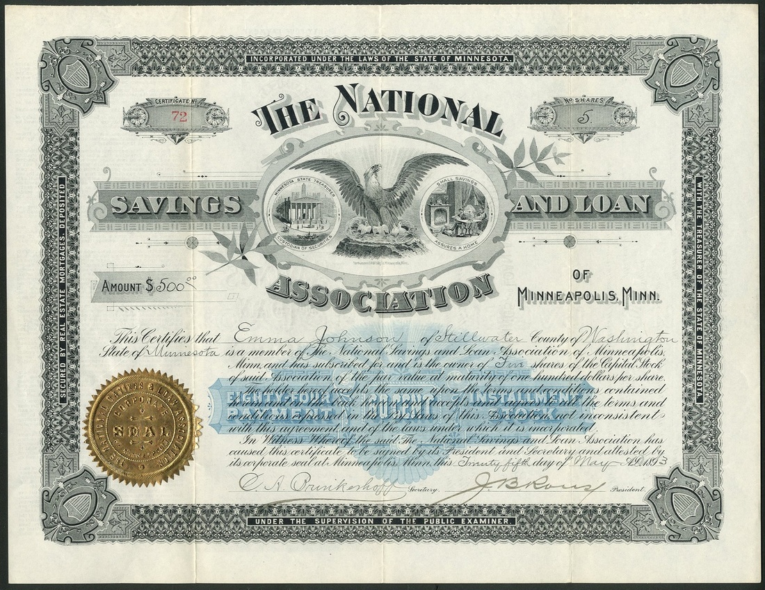 National Savings and Loan Association of Minneapolis, $100 shares, 189[3], #72, and $100 shares, $50 paid, attractive larger size certificates with interesting vignette, blue and black and yellow and black, gold seal, the second with coupons. VF (2).