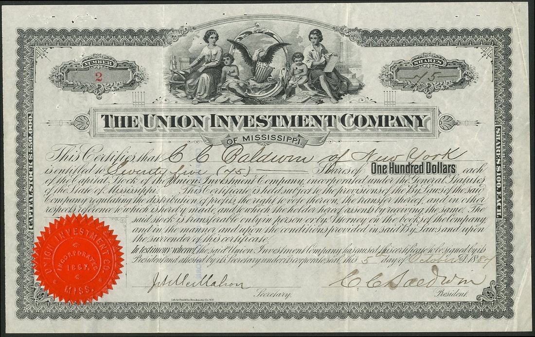 Union Investment Company of Mississippi, $100 shares, 18[87], #2, allegorical figures at top, black, red seal. VF.
