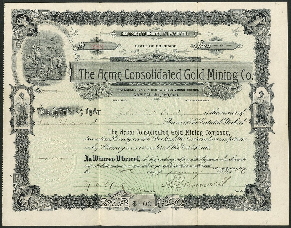 Acme Consolidated Gold Mining Co., Colorado, $1 shares, Colorado Springs 1[896], #283, miners at work, black, green underprint. Mines in the Cripple Creek District. VF.