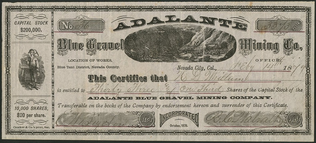 Adalante Blue Gravel Mining Co., California, $20 shares, Nevada City 18[79], #36, vignette of hydraulic mining, black, pinkish paper. Mines in the Blue Tent District, Nevada County. VF.