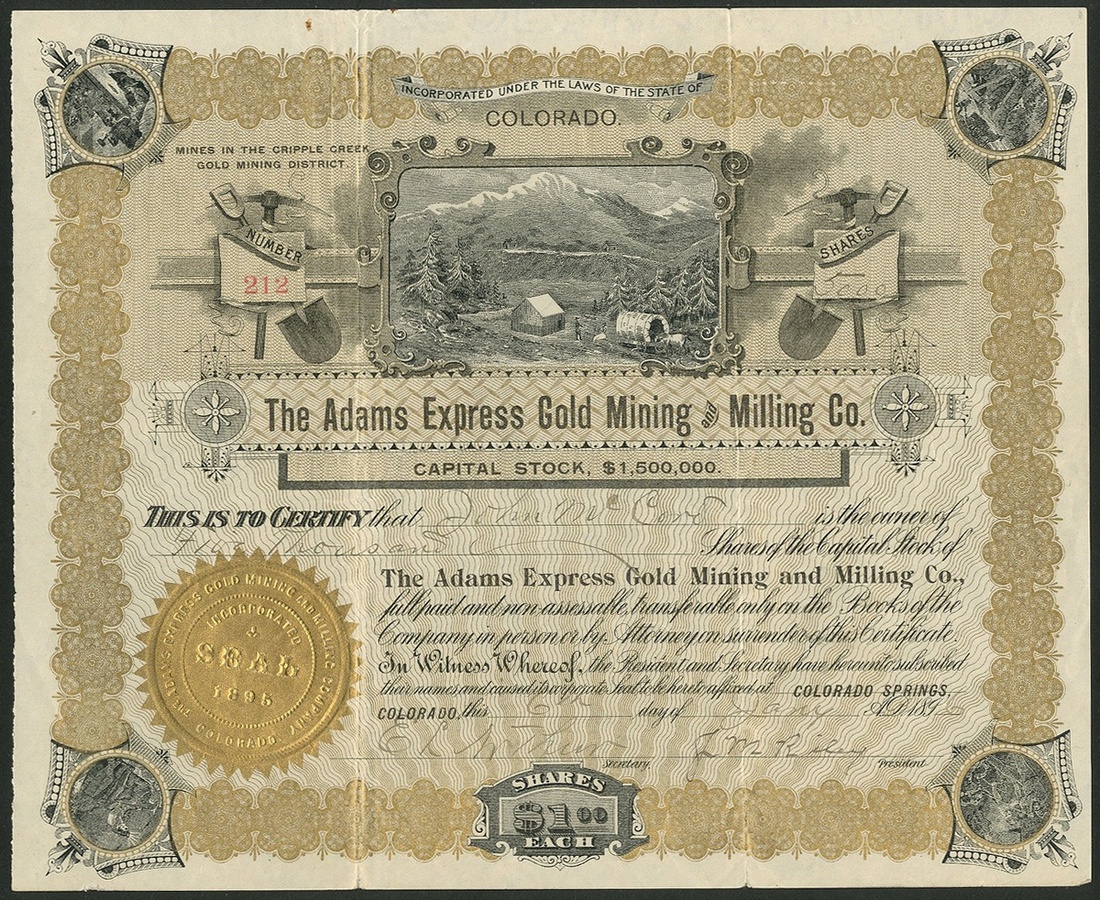 Adams Express Gold Mining and Milling Company, Colorado, $1 shares, Colorado Springs 189[6], #212, mining camp in centre, gold and black. VF.