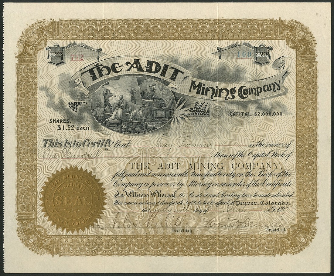 Adit Mining Company, Colorado, $1 shares, Denver 189[7], #772, miners at work, gold and black. trifolded otherwise EF.