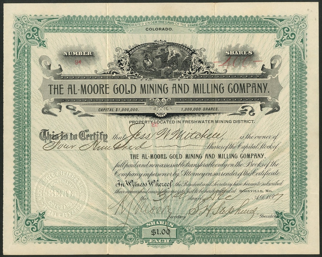 Al-Moore Gold Mining and Milling Company, Colorado, $1 shares, Boonville, Mo. 189[7], #94, miners at top, green and black. Mines in the Freshwater Mining District, later renamed Guffey Mining District, Fremont County, Colorado. GVF.