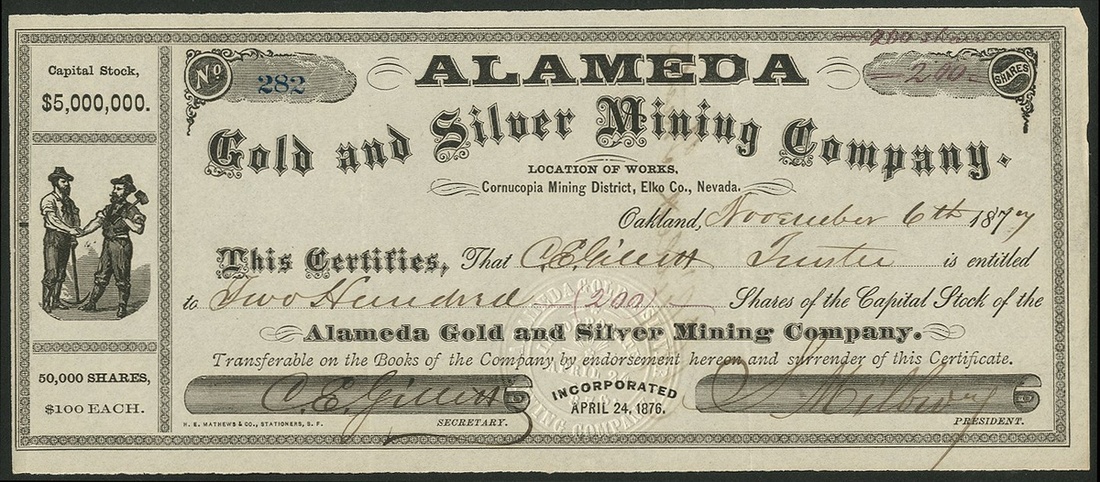 Alameda Gold and Silver Mining Company, $100 shares, Oakland 187[7], #282, 2 miners shaking hands at left, black. Mines in the Cornucopia Mining District, Elko County, Nevada. EF.