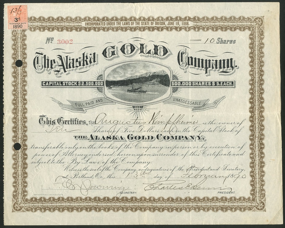 Alaska Gold Company, Oregon, $5 shares, 18[90], #3002, paddle steamer in centre, gold and black, British revenue stamp. Formed to acquire the Bear's Nest Group, part of the Alaska-Treadwell property on Douglas Island in 1888. Filing holes at left but GVF and scarce early date.