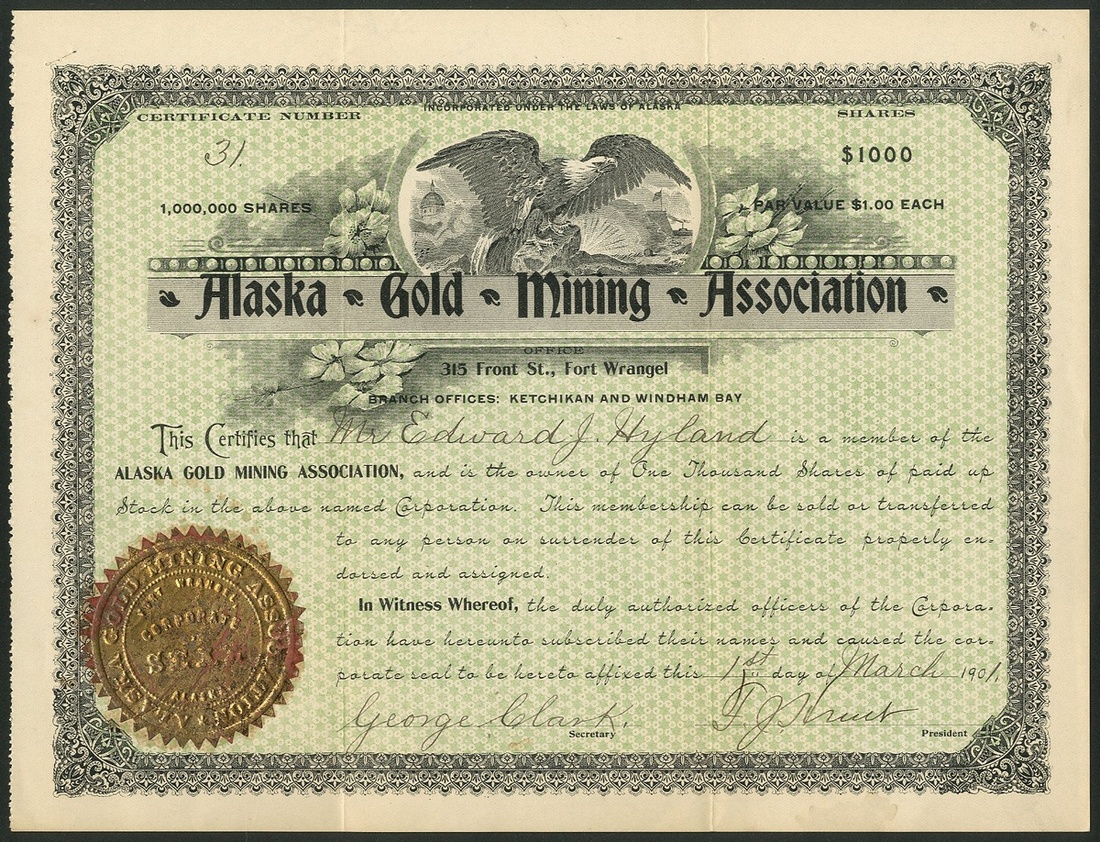 Alaska Gold Mining Association, Alaska, 1000 shares of $1, 190[1], #31, eagle at top, black, green underprint, gold seal. Incorporated in Alaska with offices at Fort Wrangel, Ketchikan and Windham Bay. Bankrupt by 1903. Most of the garnets found in the region come from this mine. GVF.