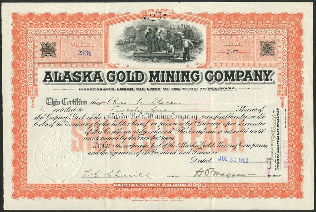 Alaska Gold Mining Company, Delaware, $1 shares, [1902], #2334, miners at top, red and black, ABNCo. printing. GVF.