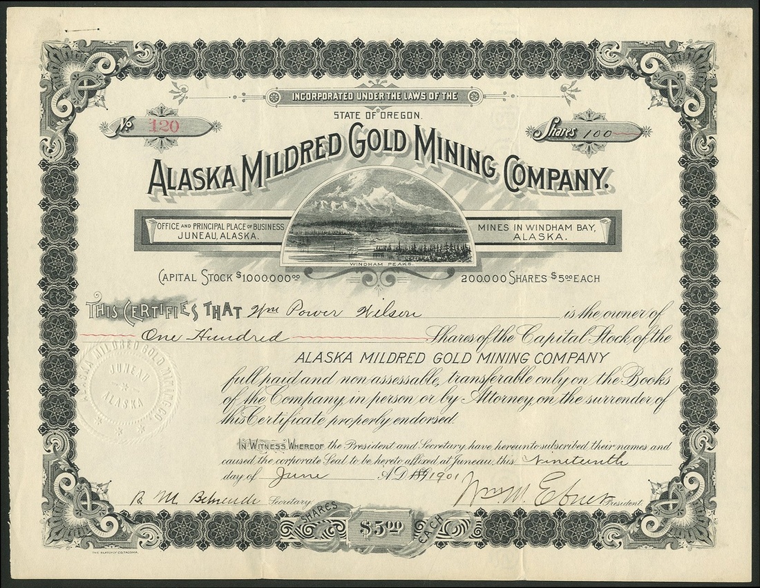 Alaska Mildred Gold Mining Company, Oregon, $5 shares, Juneau 189[1901], #120, lovely view of Windham Peake, black. Mines in Windham Bay. AEF.