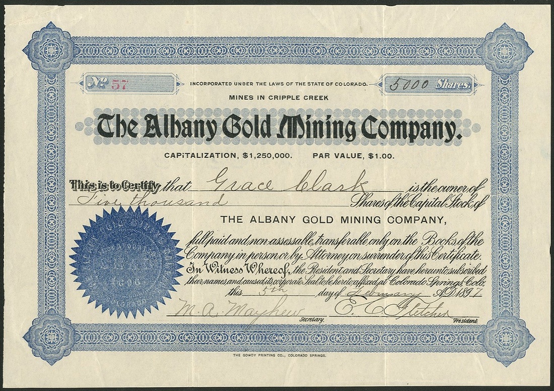 Albany Gold Mining Company, Colorado, $1 shares, Colorado Springs 189[7], #57, ornate border, blue, blue seal, Gowdy Printing Company, Colorado Springs. Mines in the Cripple Creek District. VF.