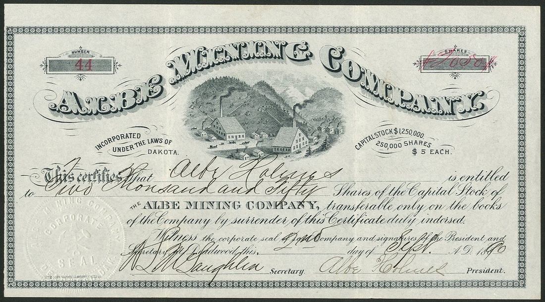 Albe Mining Company, Dakota, $5 shares, 188[90], #44, signed by Albe Holmes as President, nice mining vignette, black. Albe Holmes was early to arrive in Dakota Territory. He was also Superintendant of the Two Johns Mine at Crow Hill, Lawrence County. He was one of the 62 to ride in Seth Bullock's Cowboy Brigade in 1905, Teddy Roosevelt's inaugural parade. EF and scarce.